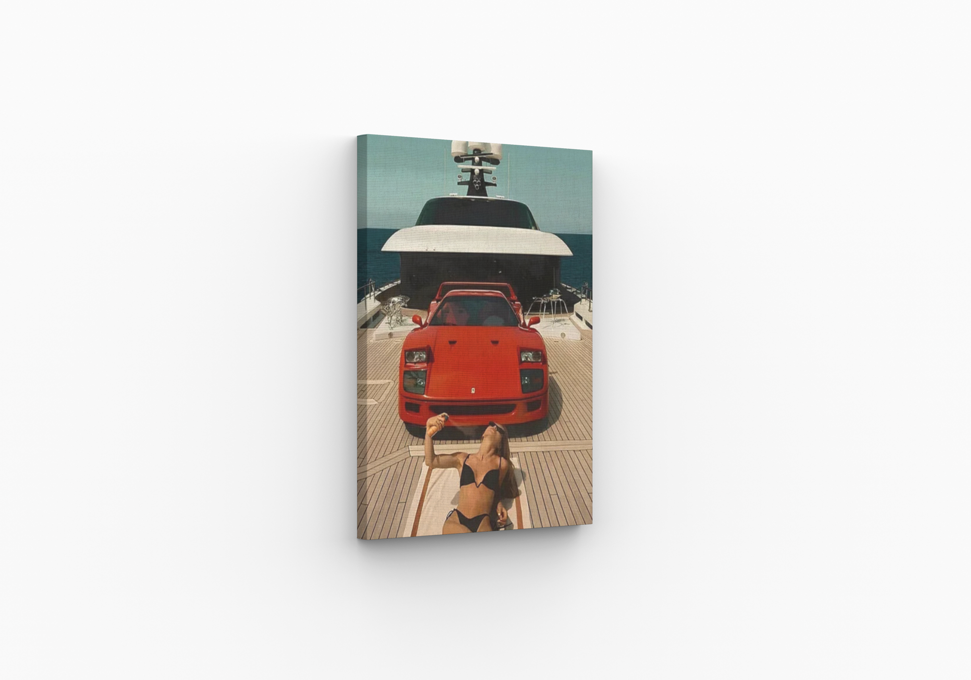 Entre yacht étincelant, voiture de collection et horizon infini, l’image évoque un art de vivre hédoniste où liberté et raffinement se rencontrent.